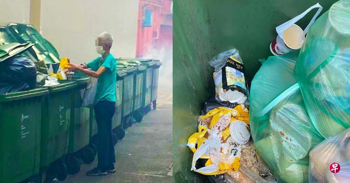 社交媒体昨天(8月22日)上载两张照片,显示一名身穿绿色T恤的白发大叔,把一个装有食物的纸袋扔到垃圾桶里。