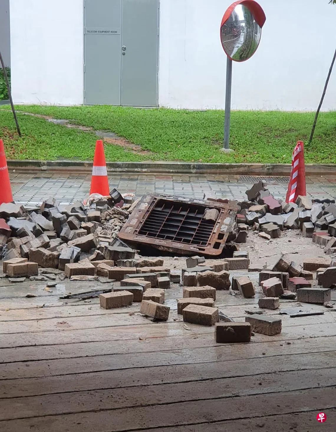 武吉巴督多层停车场出口处马路地砖爆裂弹射,砖块炸飞5米。