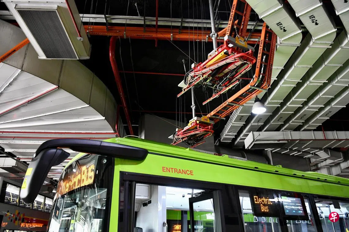 (早报讯)一按下按钮,巴士车位上方的受电弓就会启动,为巴士快速充电。