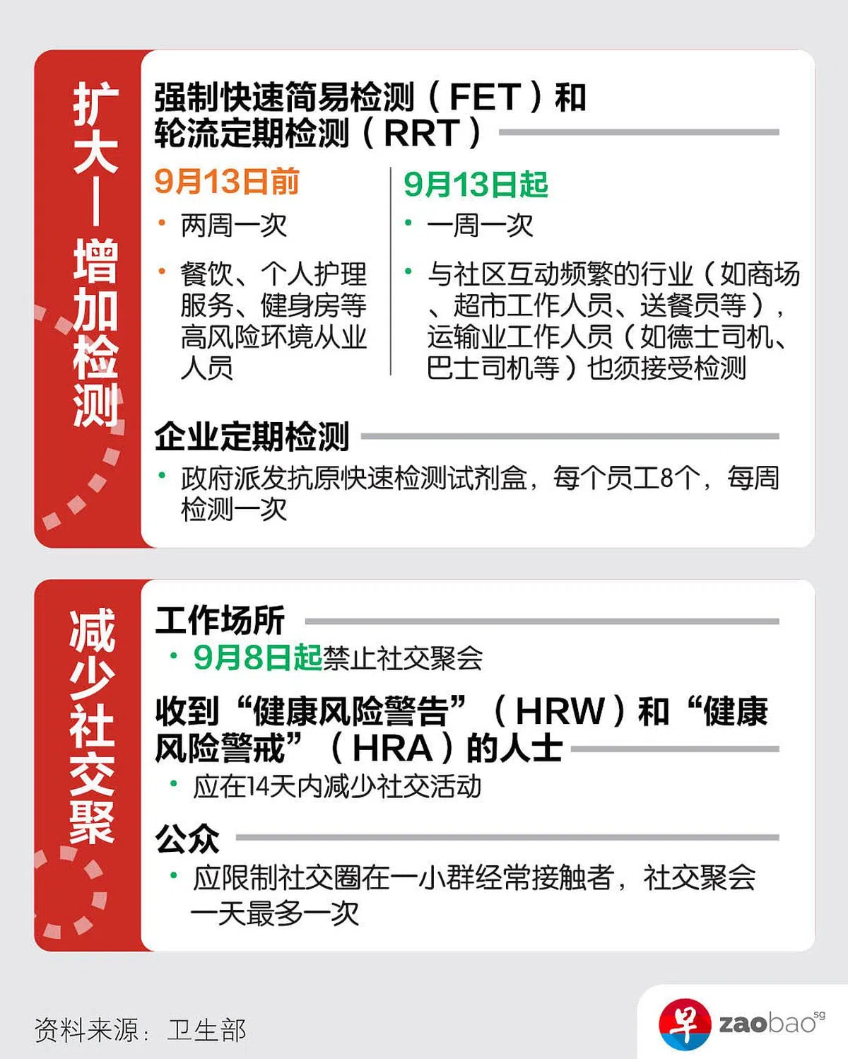 (早报讯)从9月13日起,经常与社区接触的行业员工必须每七天进行快速简易检测,包括零售商场和超市员工、前线送货和送餐员、德士和私召车司机,以及公共交通业前线人员。