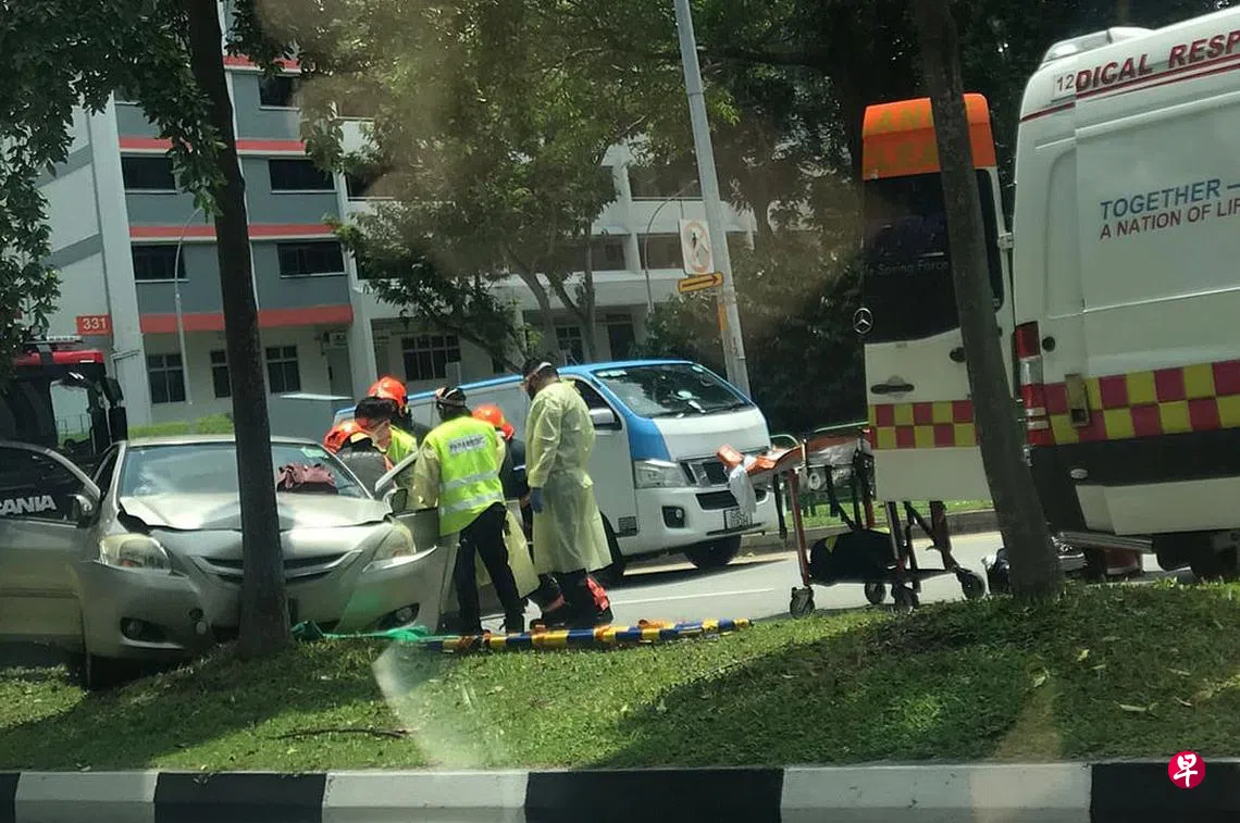 男子开车载妻女遇车祸,轿车撞树后,七旬妻“受困”近10分钟,民防人员施救,紧急送医。
