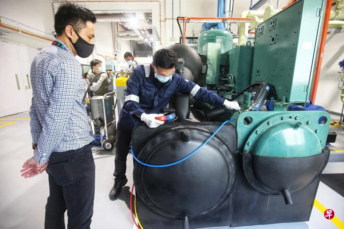 (早报讯)制冷剂氢氟碳化物在冷却设备中不可或缺,但它同时也是极具杀伤力的温室气体,随意释放入空气中将加剧气候暧化的现象。国家环境局和淡马锡理工学院因此合作推出本地首个课程,教导技术人员如何在维修或拆除商用冷却设备时,妥善处理和回收制冷剂。