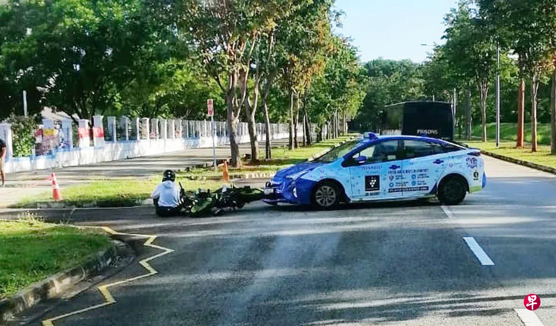 樟宜监狱一带发生车祸,一辆德士与电单车发生擦撞,电单车骑士受伤倒地,送院治疗。