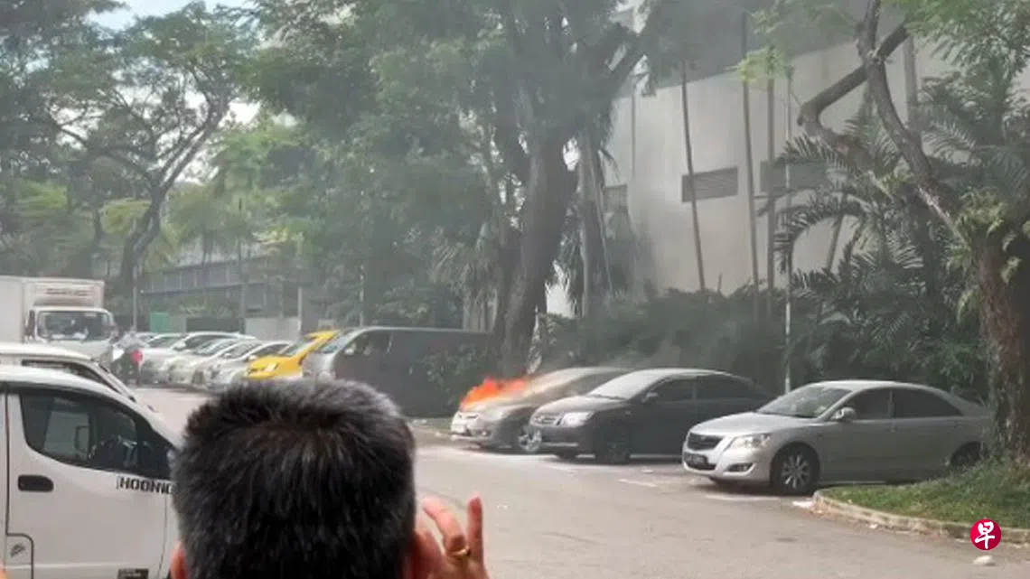 根据互联网上流传的视频,停泊在停车场的一辆汽车,车头不知何故窜起浓烟,跟着起火狂烧。