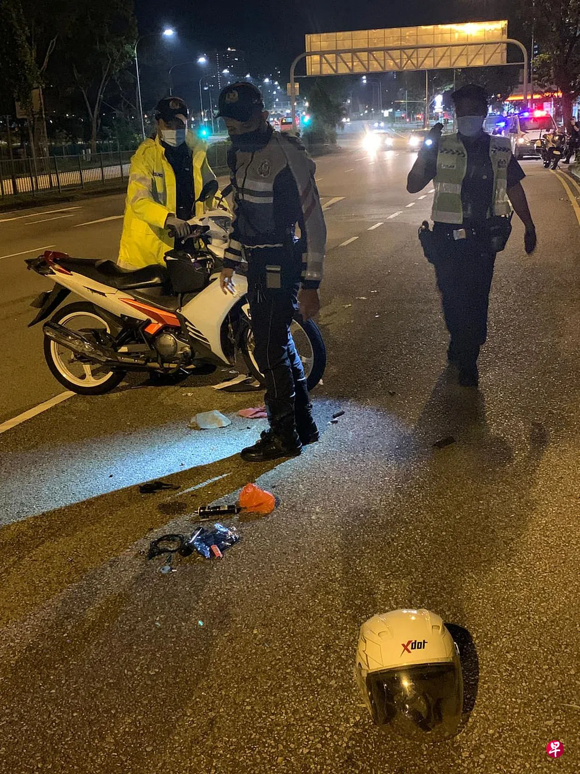 据观察,涉事的是一辆马国注册的电单车,部分零件脱落,四周地上留有喷雾、打火机、塑料袋等相信是骑士的个人物品。另外,骑士的头盔掉落在路边,警员取走了约4袋证物。
