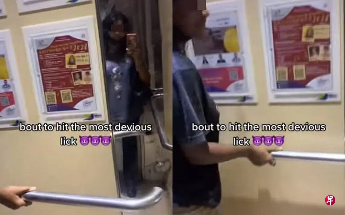 内容显示,一名少女将组屋电梯的扶手拆下,对着镜头开心的炫耀。她也在视频内配上文字,称自己要做一场最难的devious licks挑战。