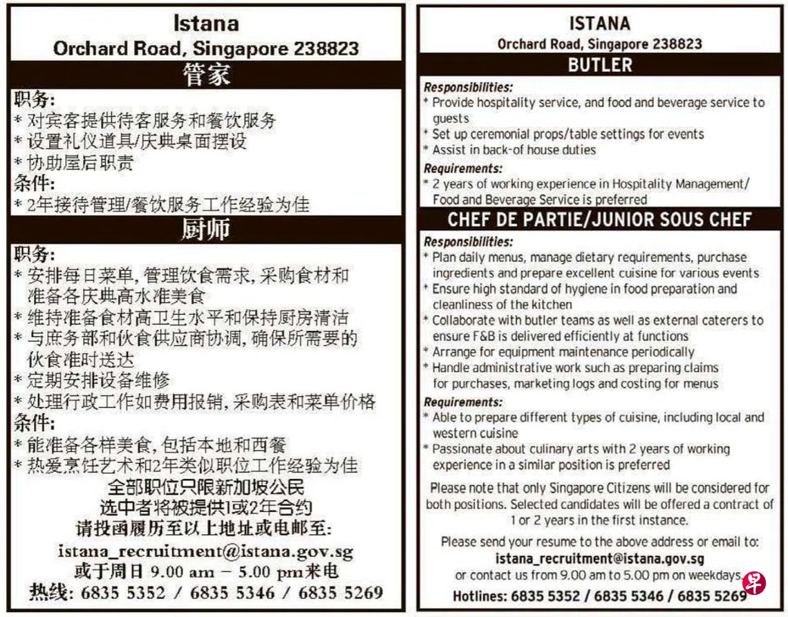 《联合早报》分类广告今天(9月28日)刊登一则总统府(Istana)招聘人手的广告,开放厨师和管家职位给新加坡公民应征。