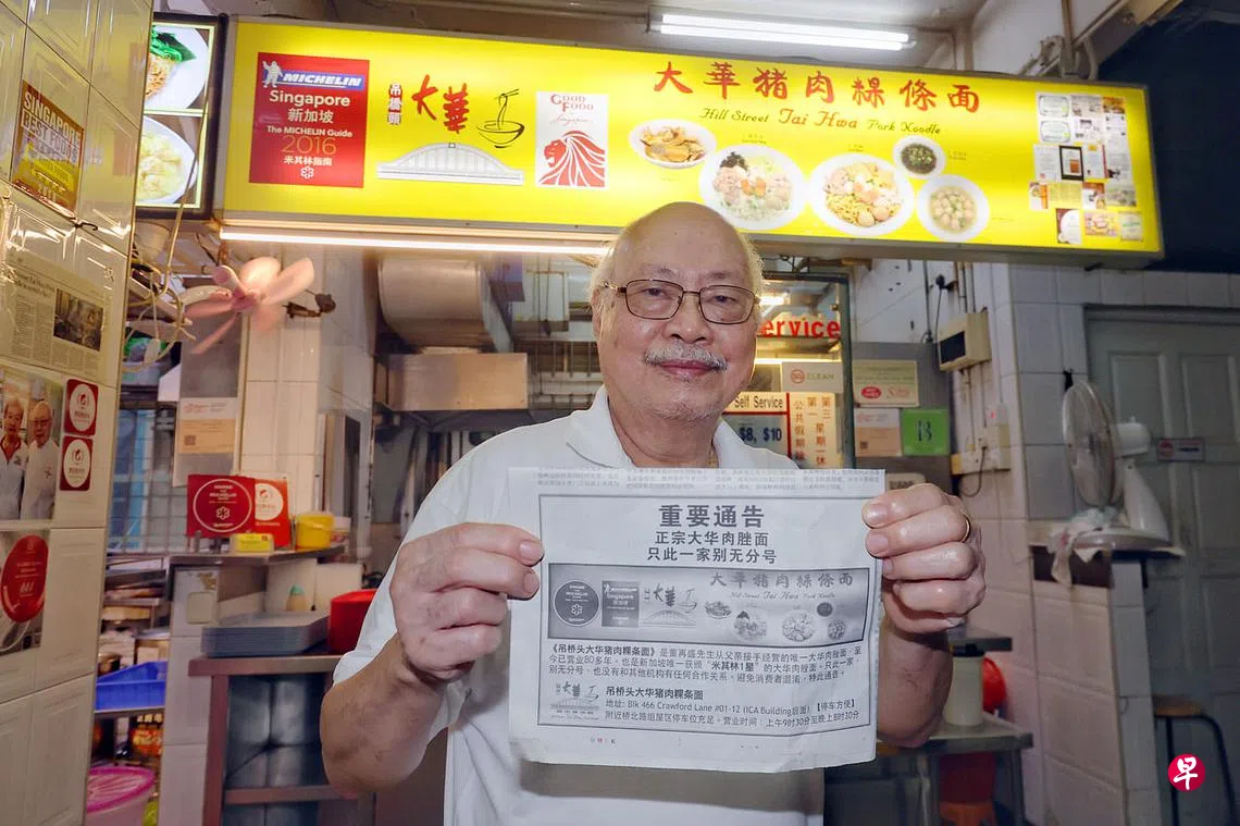 老板董再盛(74岁)今早(9月30日)在《联合早报》刊登启事澄清,自家店铺是唯一获得米其林星级推荐的“大华”肉脞面摊位,“别无分号,也没有和其他机构有任何合作关系”,希望消费者勿要混淆。