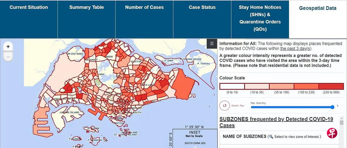 公众即日起可上网查询哪些地区曾有较多确诊者到访。卫生部的covidsitrep.moh.gov.sg网站已增设地理空间数据,通过可互动地图的方式,以病例人数为标准,标示出全岛各个地区过去三天有多少确诊病例到访。这些数据并不代表病患就住在那里。