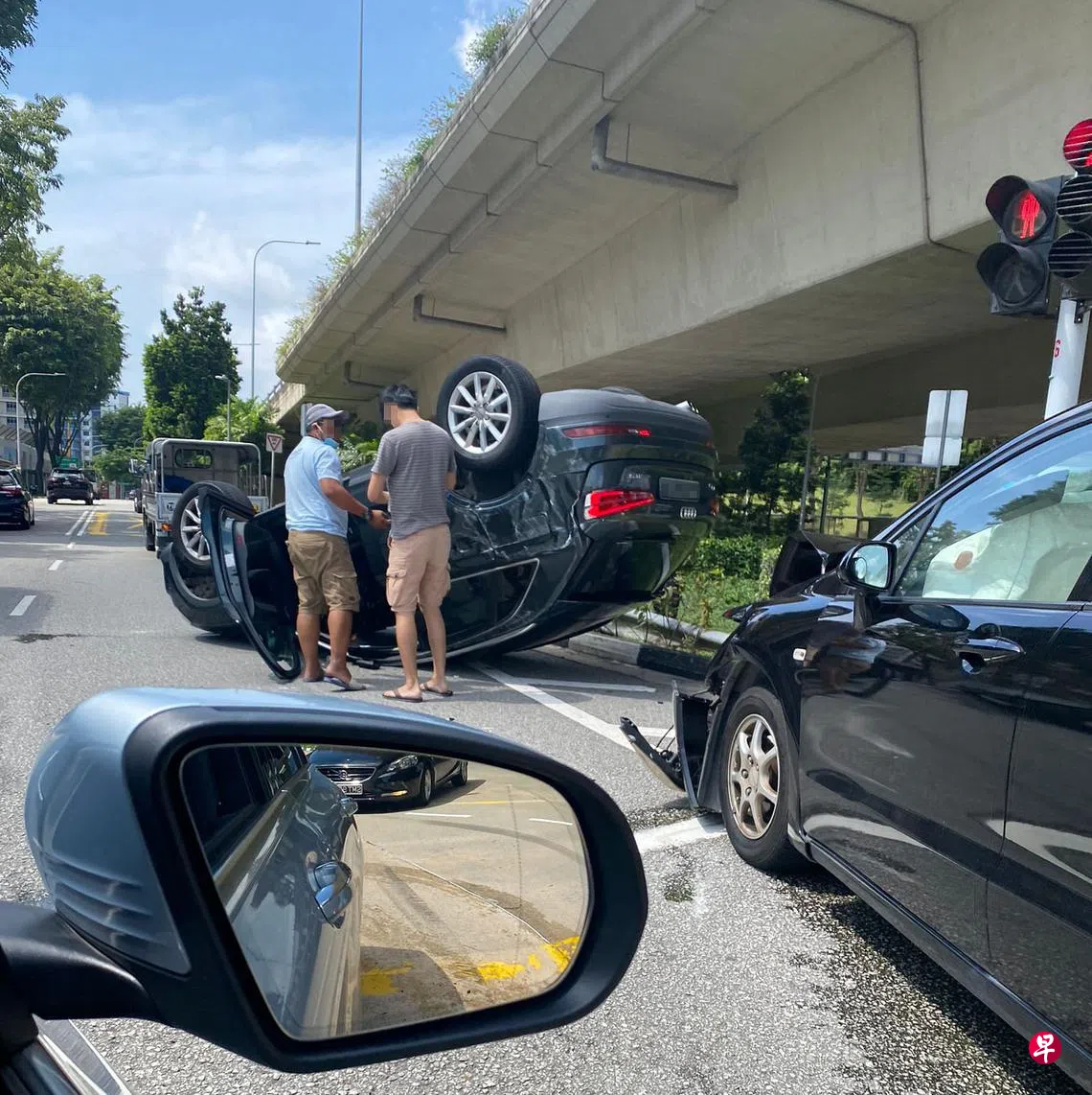 读者陈先生(45岁,装修业)今早经过该路段时,看见有一辆奥迪轿车翻覆在路上,车子还冒出白烟。
