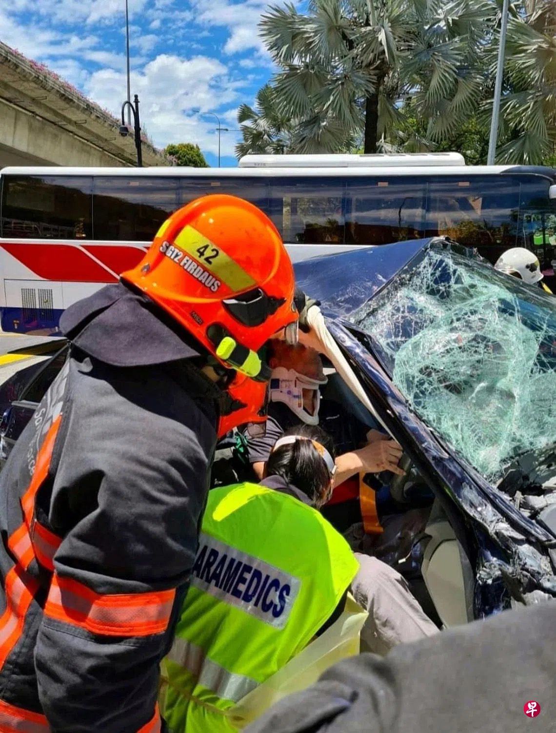 根据贴文,民防人员闻讯赶到现场时,发现一名男子受困黑色汽车的驾驶座上。该辆黑色汽车把交通灯撞倒后车头严重损坏,民防人员展开救援时必须小心翼翼,确保车子稳定,以免加重受困男子的伤势。