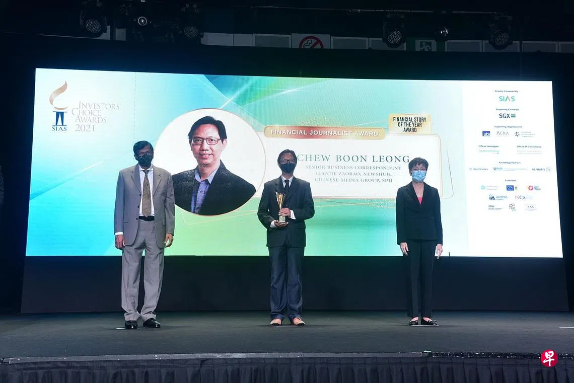 (早报讯)2021年新加坡证券投资者协会(SIAS)“投资者的选择”奖项,新加坡报业控股华文媒体集团新闻中心财经新闻资深高级记者周文龙获得年度财经新闻奖(Financial Story of the Year)。