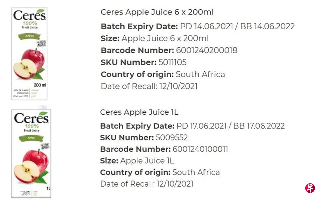 贴文说,受影响产品为“Ceres”品牌的苹果汁,分别有6x200毫升和1公升两种包装。