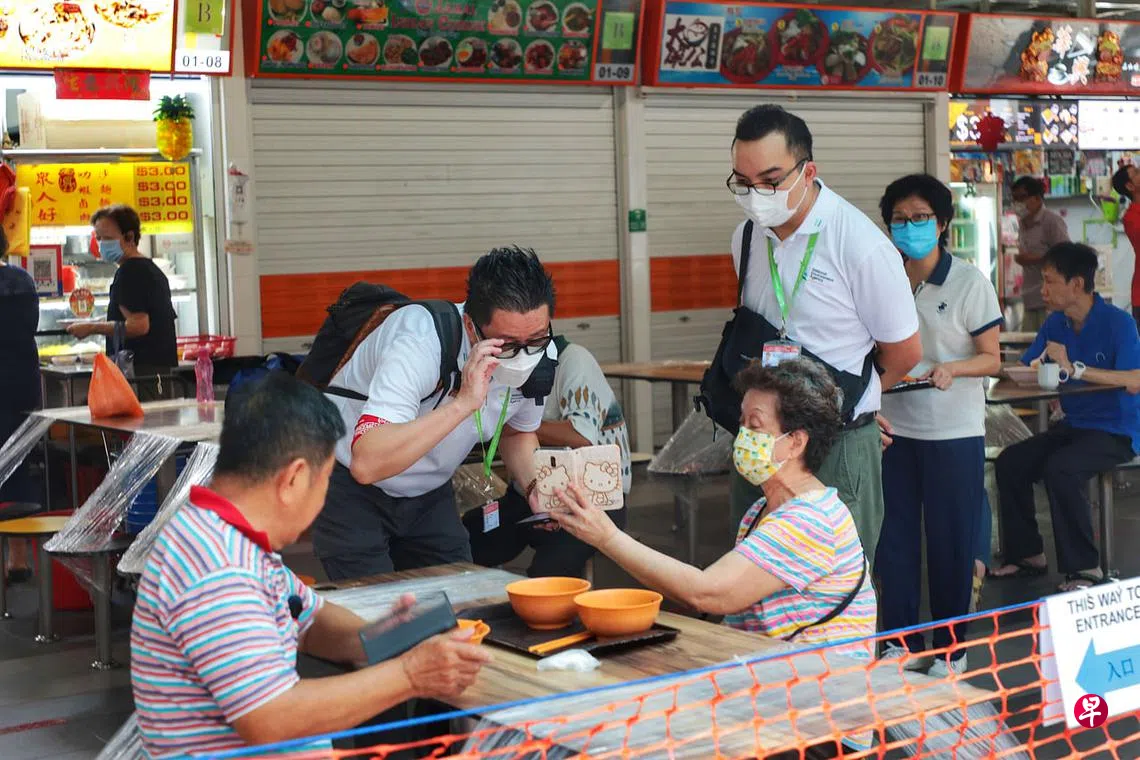 (早报讯)小贩中心和咖啡店今天(10月13日)起不允许未接种者堂食,据观察只有少数的违例食客当场被发现,但安全距离执法人员给予通融,让食客吃完后才离开。