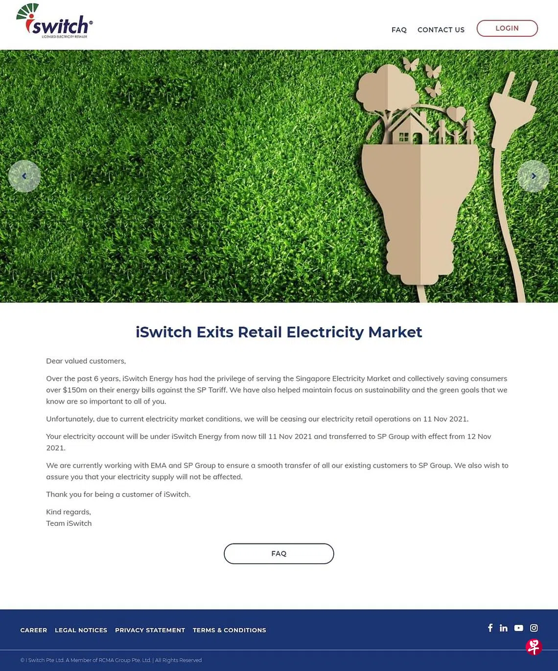 (早报讯)电力零售商iSwitch宣布将于下个月11日退出零售电力市场,本地约9万名家庭用户受影响,消费者协会强调消费者权益受保障。