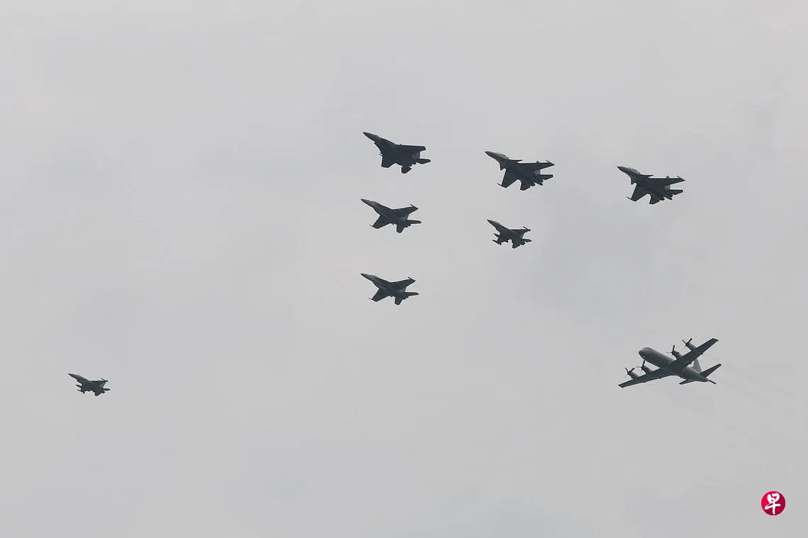 今天中午的空中巡礼分三个部分进行。第一部分为新加坡空军部队呈献的三角队形,第二部分为由五国的战斗机、海上侦察机及直升机联合组成的飞行表演,第三部分是由新加坡空军部队F-16和F-15SG战斗机呈献“星花绽放”(bomb burst)队形。