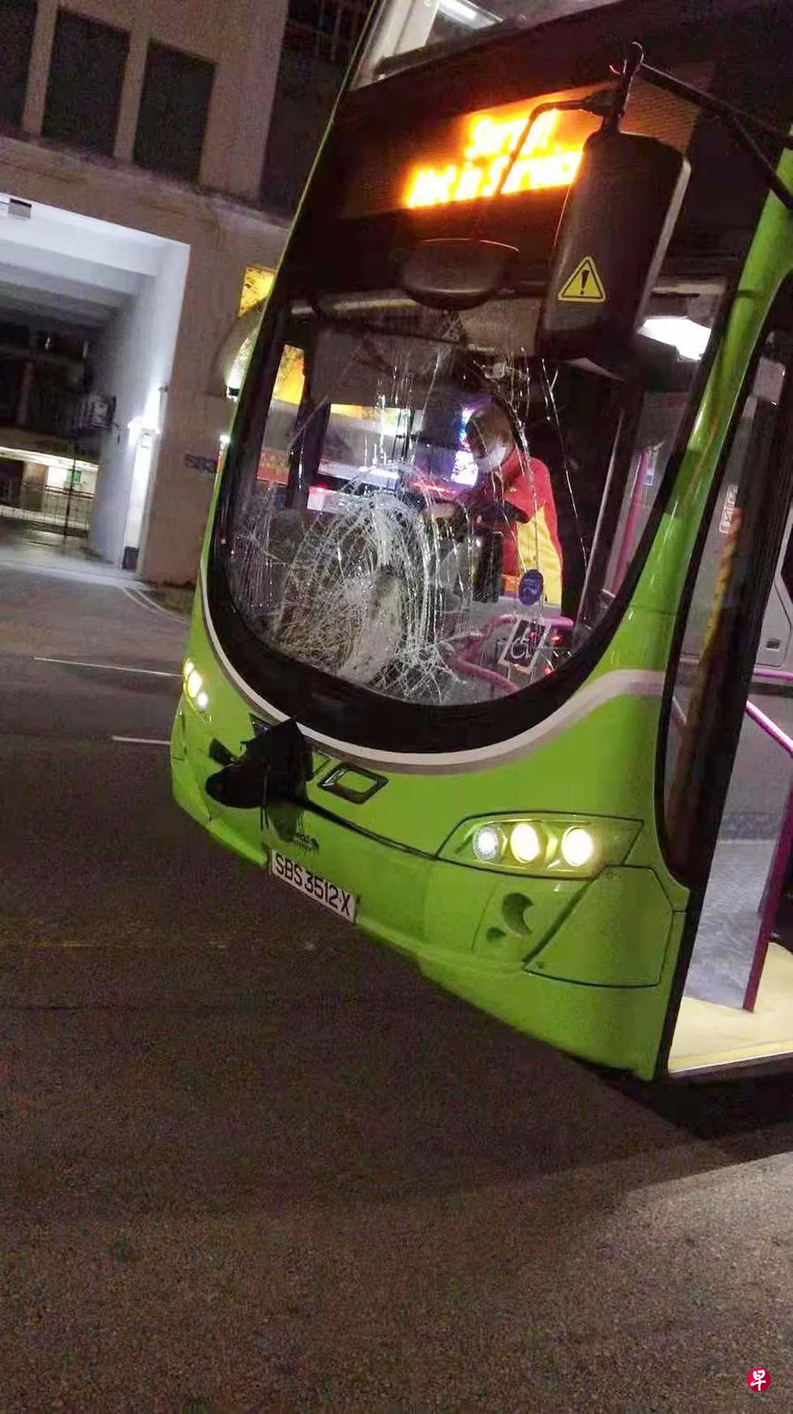 根据读者提供的视频和照片画面,女路人被撞倒后,面部朝下倒卧在地,一辆“前进新加坡”(Go-Ahead Singapore)的2号路线巴士停在不远处,挡风镜裂成蜘蛛网状。