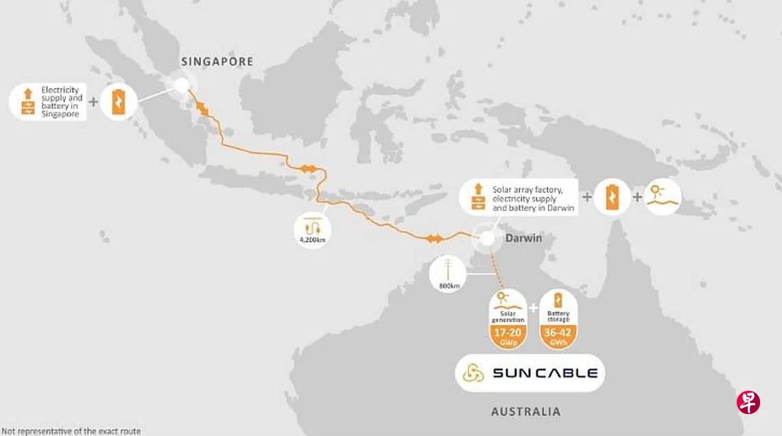 澳亚电力链接是世界最大可再生能源基础设施项目之一。Sun Cable将结合各种科技和基础设施,在北澳发展一个世界最大的太阳能农场之一(17-20千兆峰瓦/GWp);世界最大的电池(36-42千兆瓦时/GWh);以及世界最长的高压直流输电(HVDC)海底电缆,从澳洲达尔文到新加坡(约有4200公里)。项目预期2023年底动工,在2026年供电至达尔文,2027年供电至新加坡。到2028年时有能力满足新加坡15%电力需求。