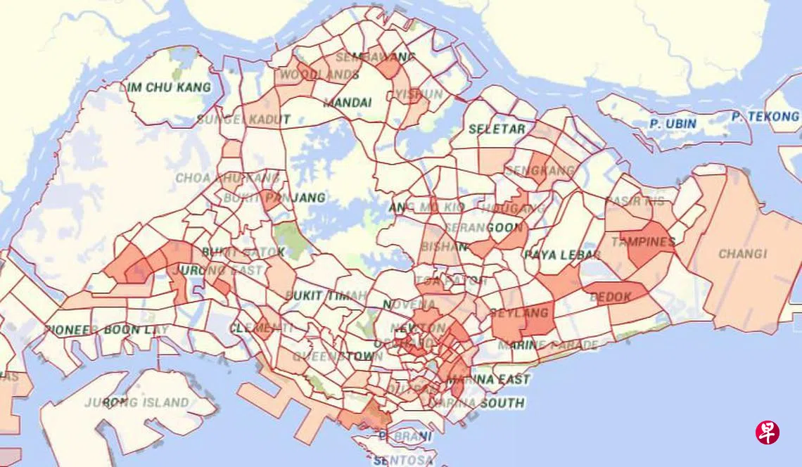 过去三天出现最高病例介于421起至925起的“黑区”有九个,分别是乌节林荫道(Orchard Boulevard)、索美塞(Somerset)、滨海湾湾景(Bayfront Subzone)、劳明达、芽笼东、勿洛北、淡滨尼东、裕廊商业区(Jurong Gateway)以及裕廊西中心。
