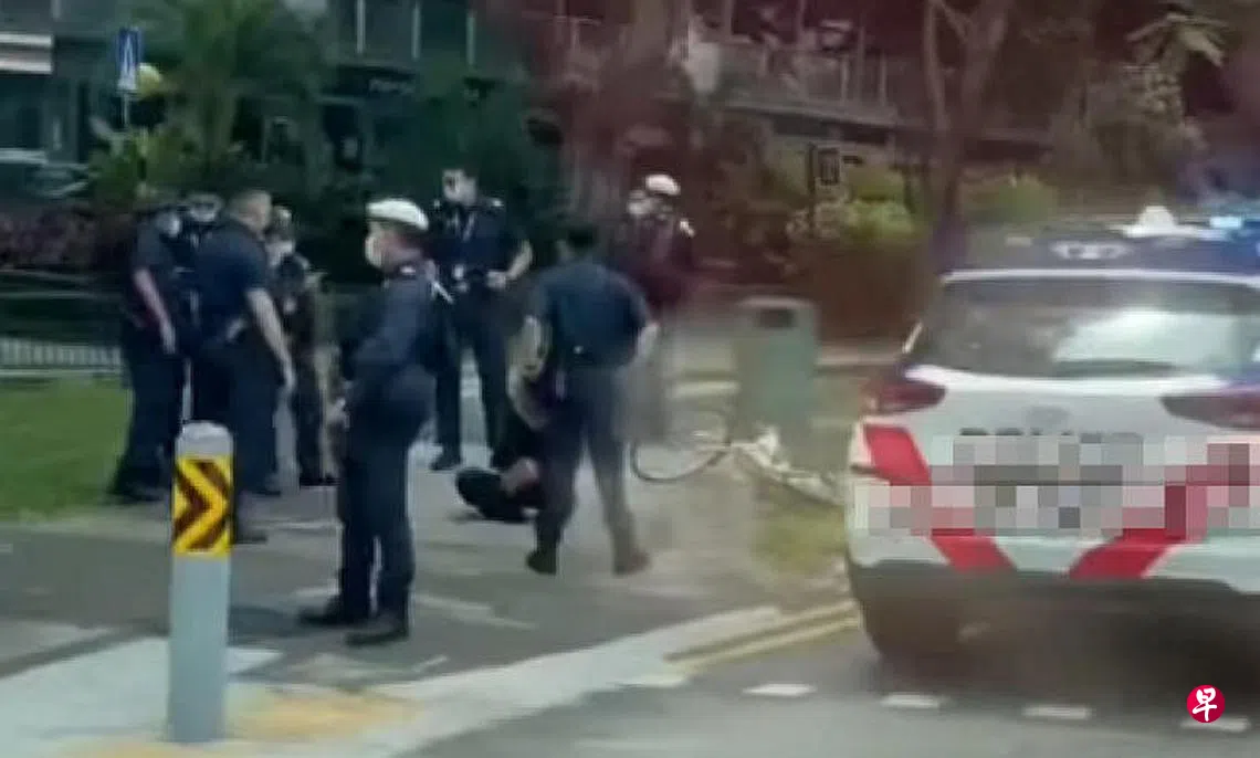 根据面簿专页Singapore Incidents上传的一段15秒视频,一名妇女被警员制服后,坐在斑马线附近的人行道上。