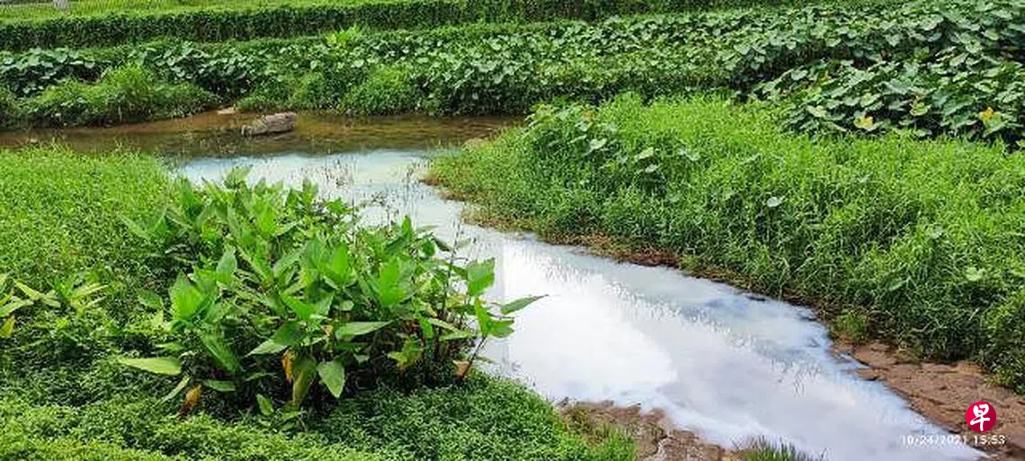 这起事故发生在上星期日(24日)下午,本报读者段先生(48岁,电脑工程师)带着妻小四人到碧山宏茂桥公园运动,经过新民径旁的加冷河时,发现有一段河水被染成了乳白色。