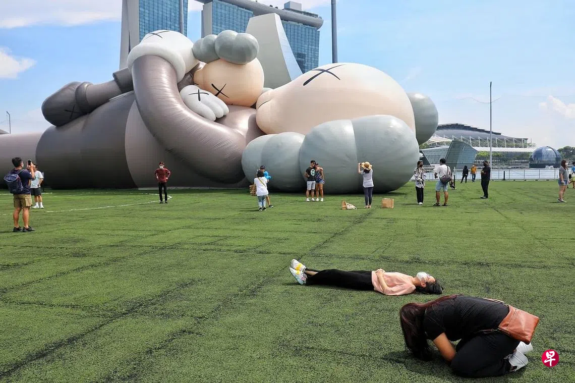 (早报讯)“Kaws:假日”巡回展新加坡站今天在滨海湾浮动舞台恢复展出,吸引大批公众与42米的巨型吹气玩偶“同伴”(Companion)合影留念。