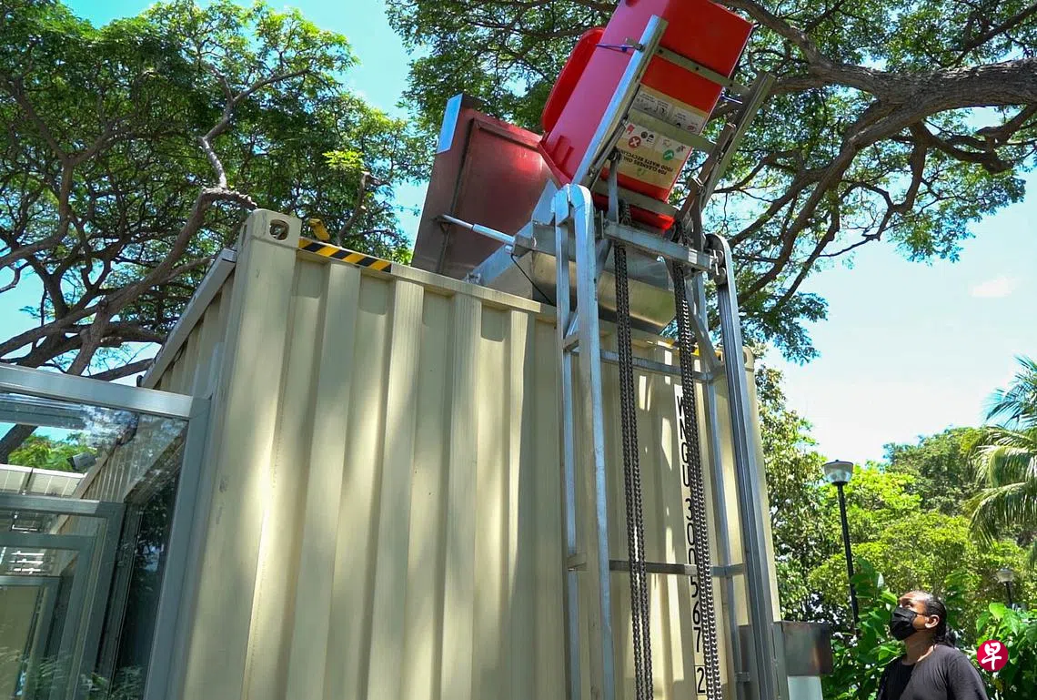 (早报讯)东海岸人工湖美食村试用新厨余处理系统,可就地处理摊贩的厨余和食客吃剩的食物,将这些食物垃圾转化为肥料,或者为小贩中心内的风扇和手机充电站供电。