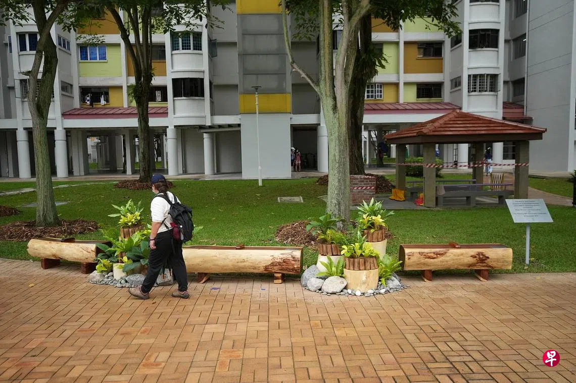 (早报讯)得砍伐的树木赋予新用途,制作成木凳,摆放在宏茂桥的邻里公园和户外空间,让居民歇脚。
