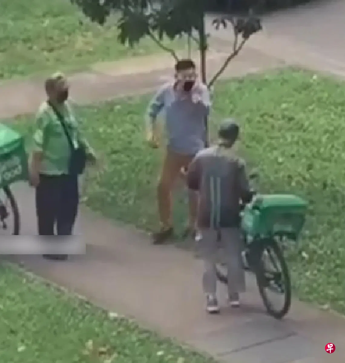 社媒SGFollowsall前天(11月19日)发布一段视频,画面显示,一名身穿蓝衣的男子站在走道上,一名送餐员经过时摇动了脚车铃声,男子或未听见而没让路,相信因此撞到,进而发生争吵。
