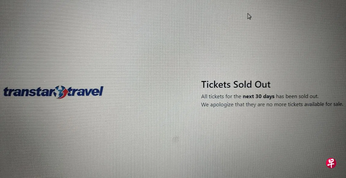 (早报讯)新马疫苗接种者陆路旅游走廊(VTL)往返新柔的短程巴士车票今早(11月25日)8时开卖,新加坡这边指定的巴士业者星运旅游(Transtar)的网站因出现故障,一度显示从下星期一(29日)起至12月底,未来30天的车票,在短短半小时被抢购一空。
