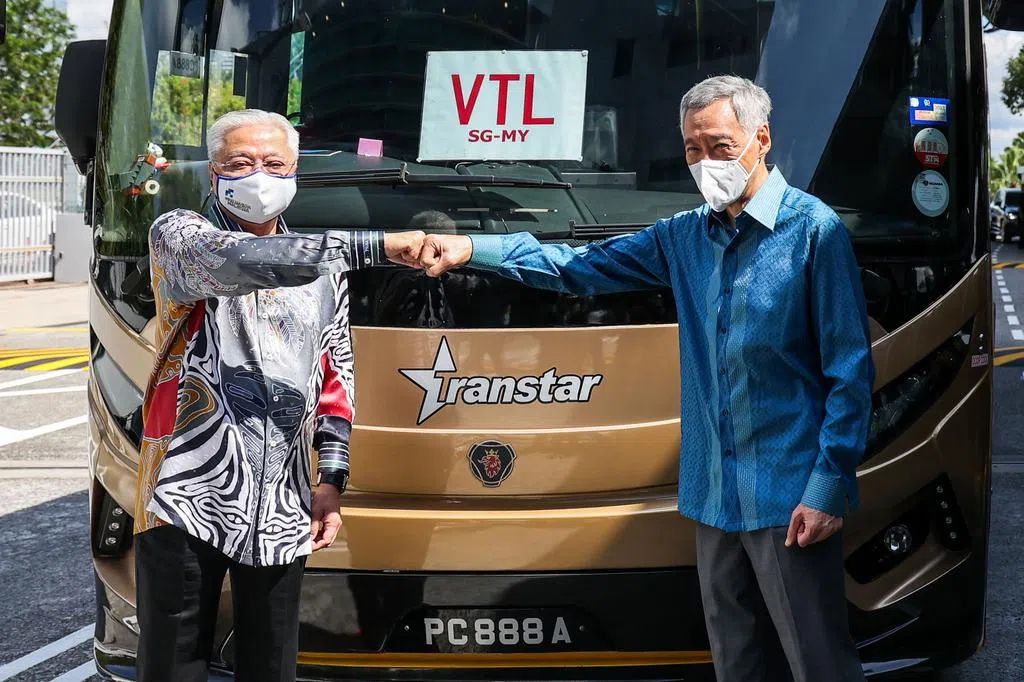 (早报讯)李显龙总理和马来西亚首相依斯迈沙比里今早在新柔长堤,共同见证疫苗接种者旅游走廊的启动仪式,两人也在新加坡—新山跨境巴士前互相碰拳留影。