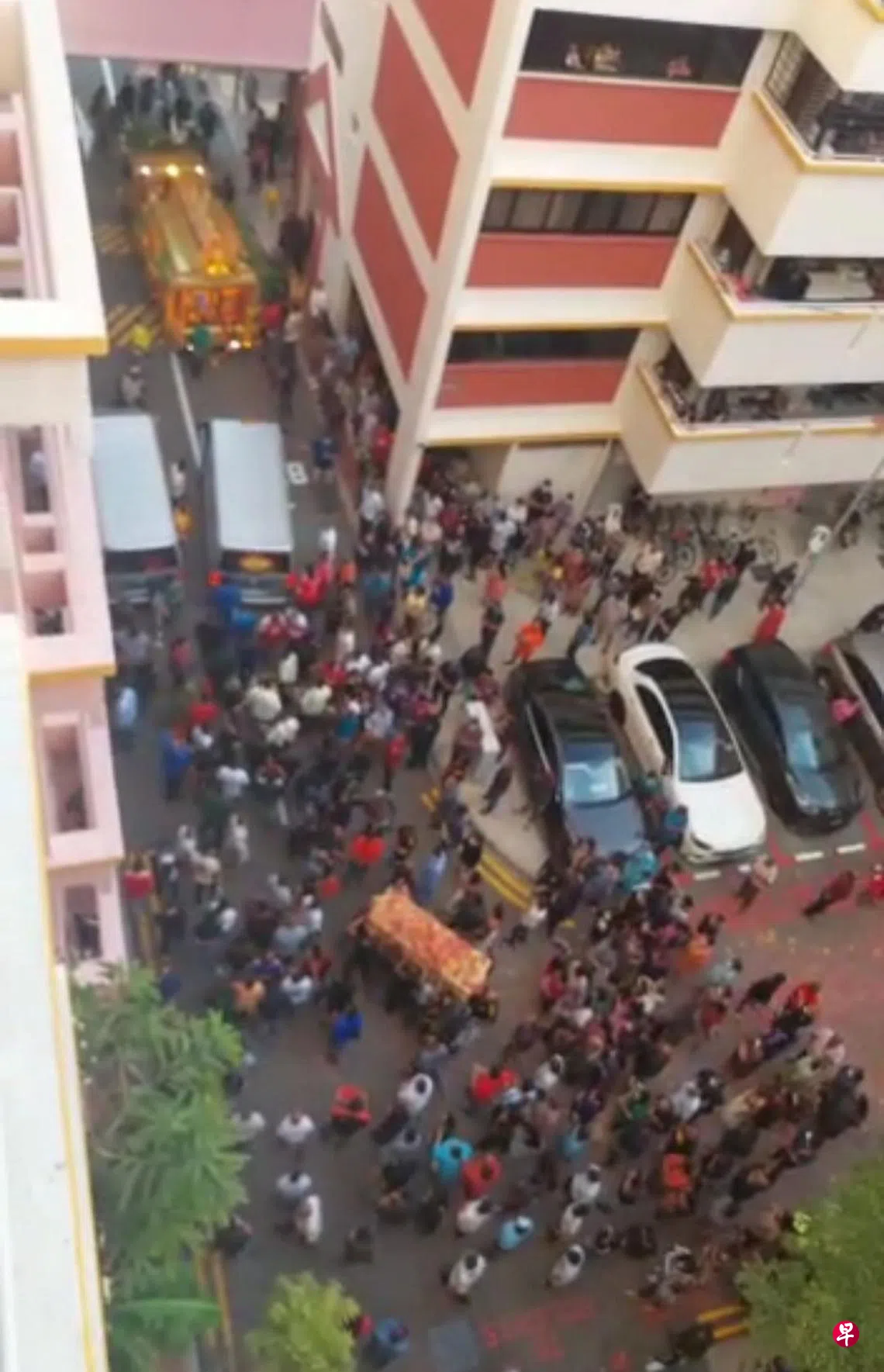 视频画面显示,当时有超过100人聚集在组屋楼下,当灵柩从灵堂处被抬出来时,出席者也随着音乐高歌。