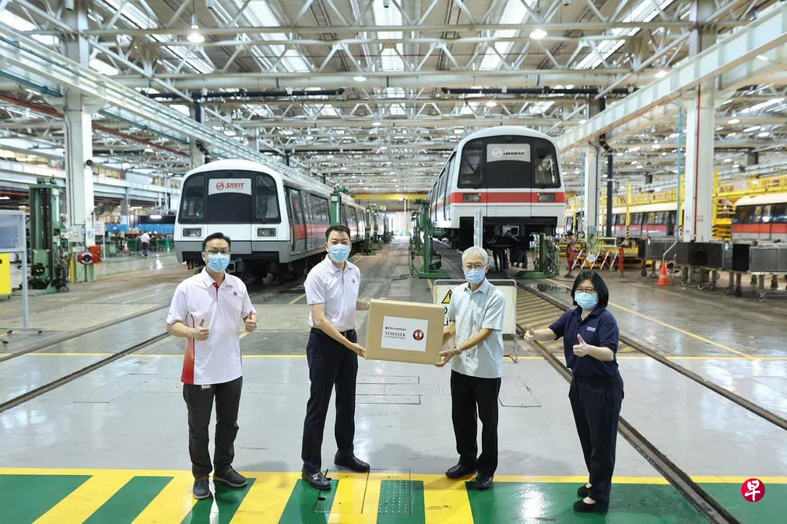 淡马锡基金会董事顾蔡矶今天(12月2日)在SMRT碧山车厂举行的仪式上,将2万零500个血氧仪递交给全国交通工友联合会(NTWU)执行秘书杨益财。