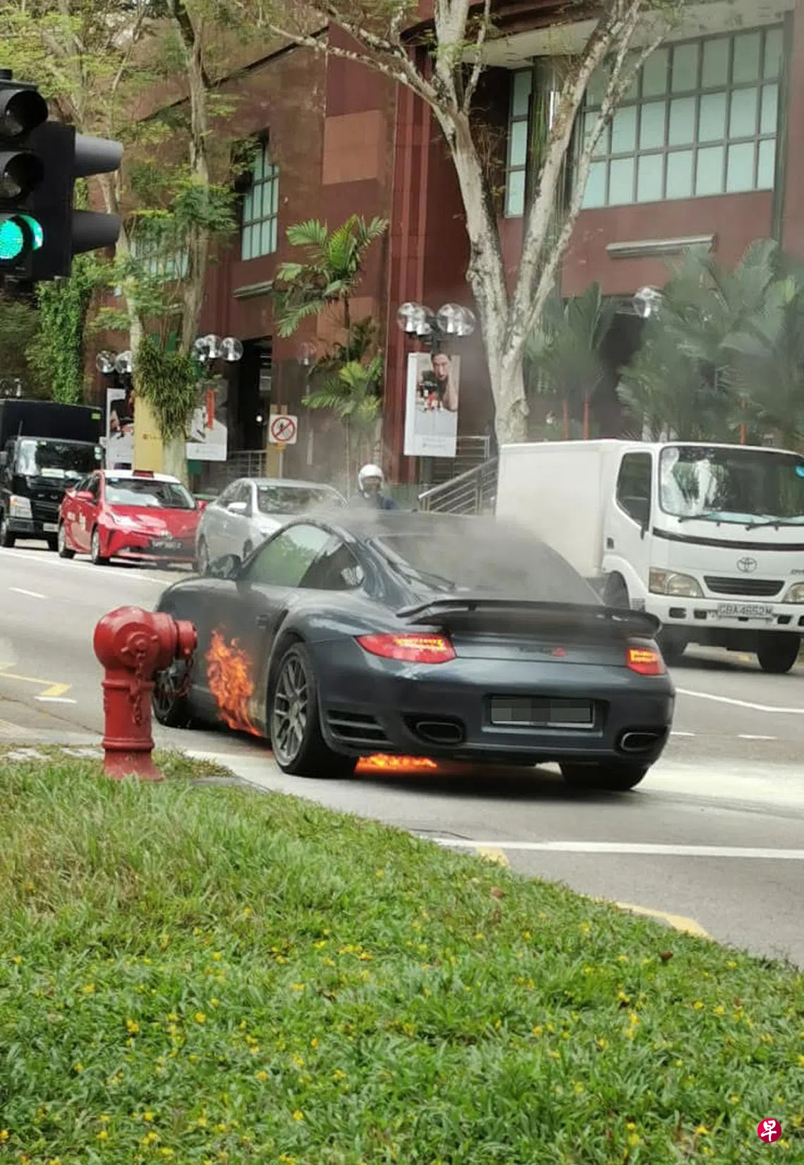 乌节路义安城附近,一辆行驶中的保时捷超跑不知何故失火,冒出滚滚浓烟。
