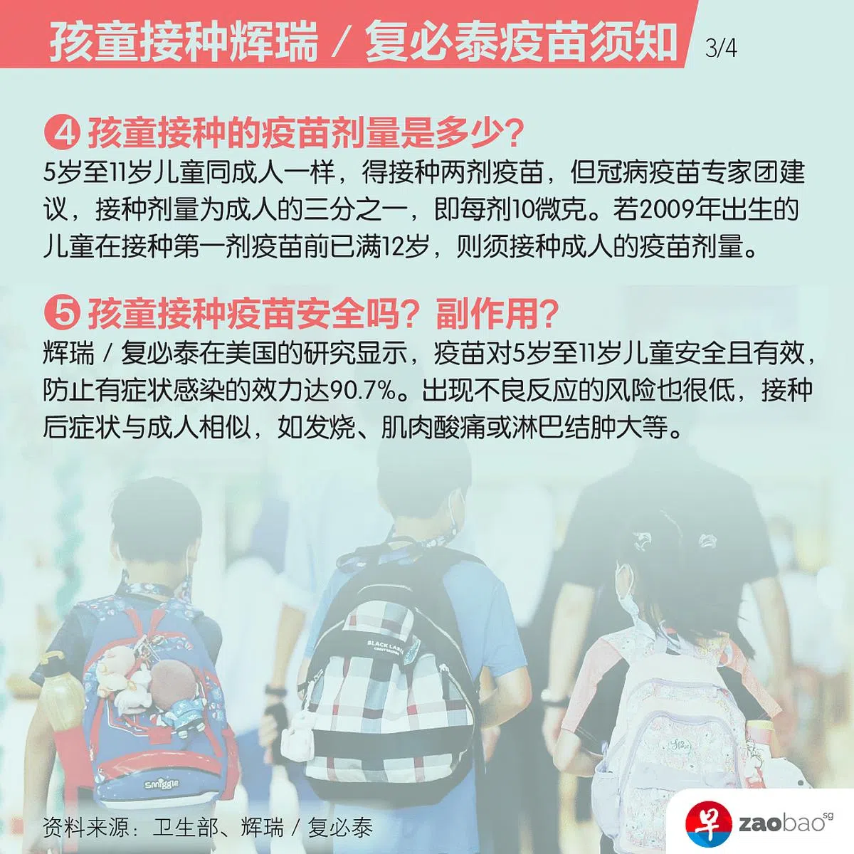 卫生科学局较早前已批准让5岁至11岁儿童接种辉瑞/复必泰疫苗。冠病疫苗专家团建议,这一年龄层的儿童接种两剂疫苗之间的间隔期为21天,剂量只有成人的三分之一,即每剂10微克。