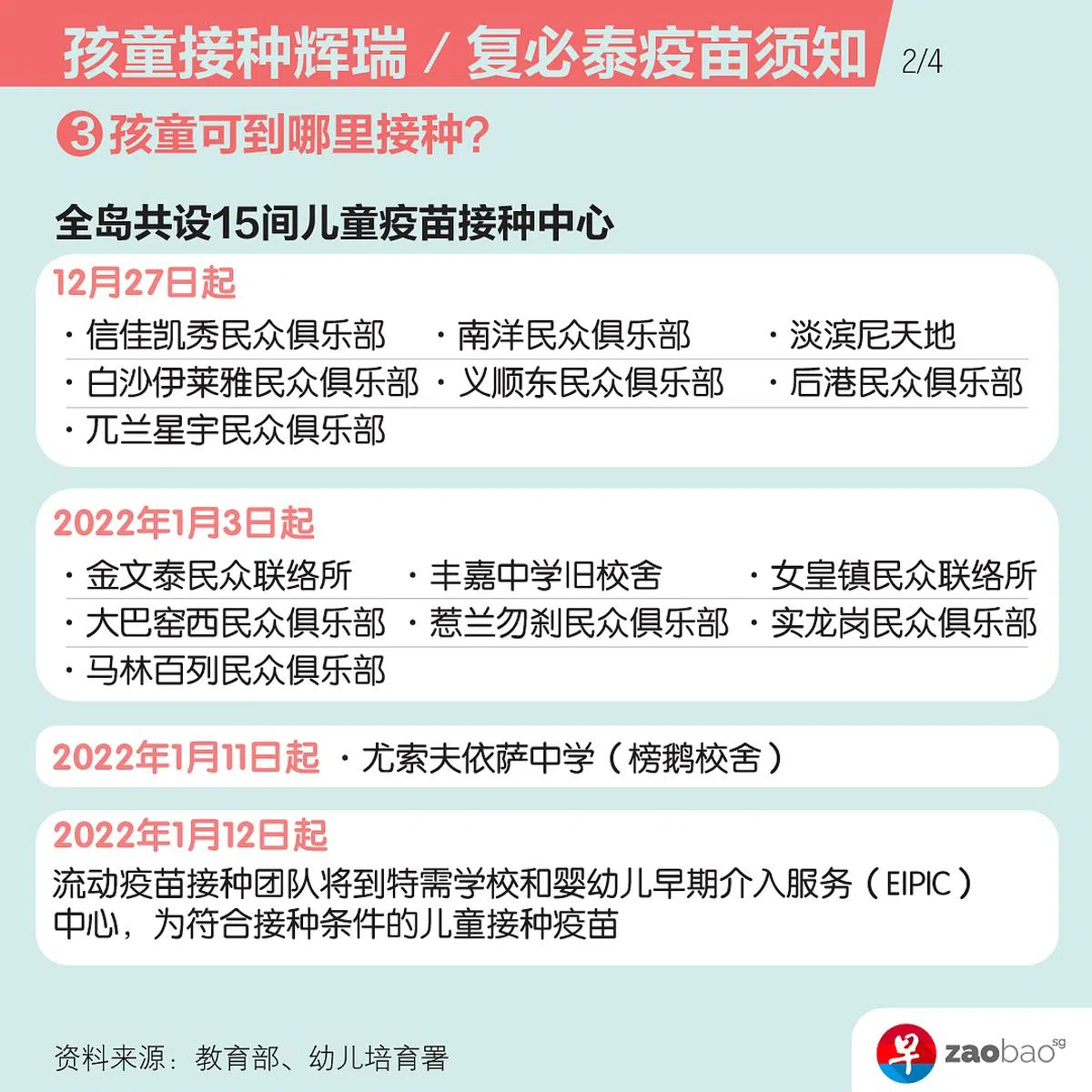 从明年1月第二周起,疫苗接种预约将开放给所有新加坡公民、永久居民以及持长期准证的五岁以上儿童。无论孩子就读的学校类型,父母或监护人都可到卫生部的网站为孩子注册接种疫苗。