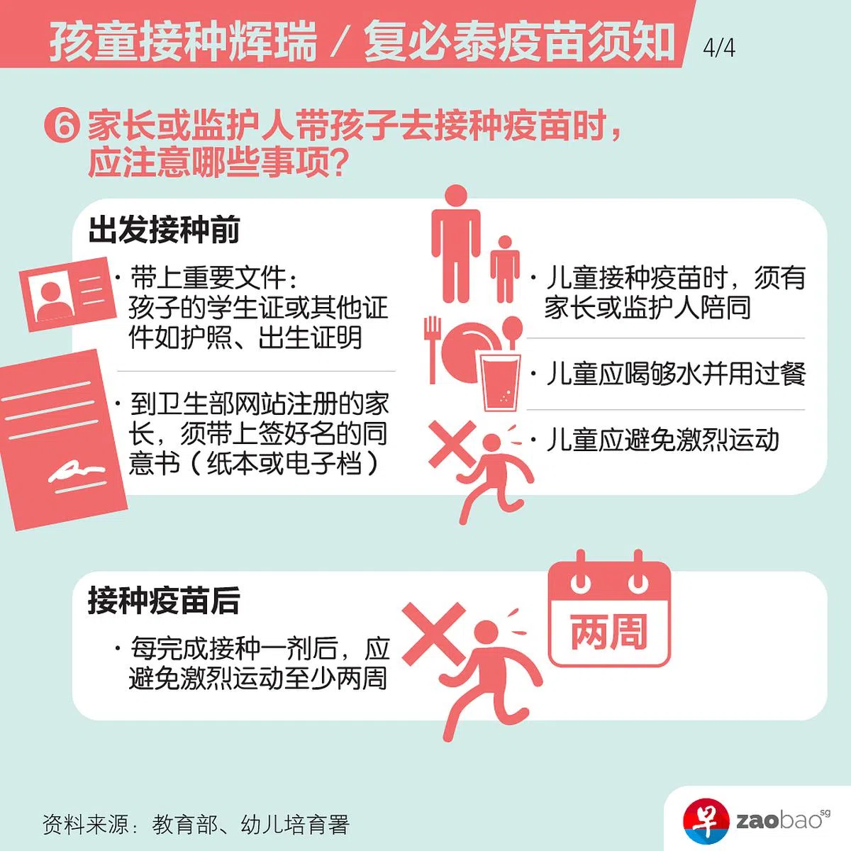 所有儿童也须在一名父母或监护人的陪同下,到疫苗接种中心注射疫苗。家长或监护人也要带着孩子的学生证或其他如护照等,早前上网表达接种意愿者,也必须签署并出示同意书。
