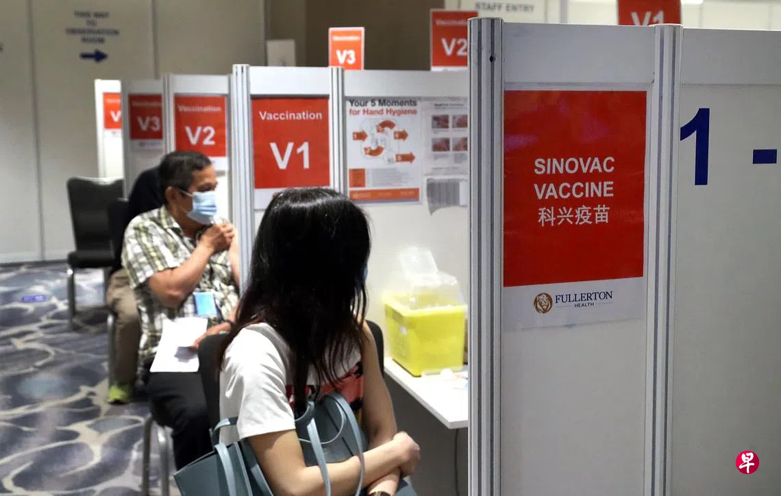 (早报讯)接种两剂中国科兴冠病疫苗超过三个月的公众,即日起可以直接到指定的疫苗接种中心打第三剂疫苗,以完成冠病疫苗接种程序。这些公众不用提前上网预约。
