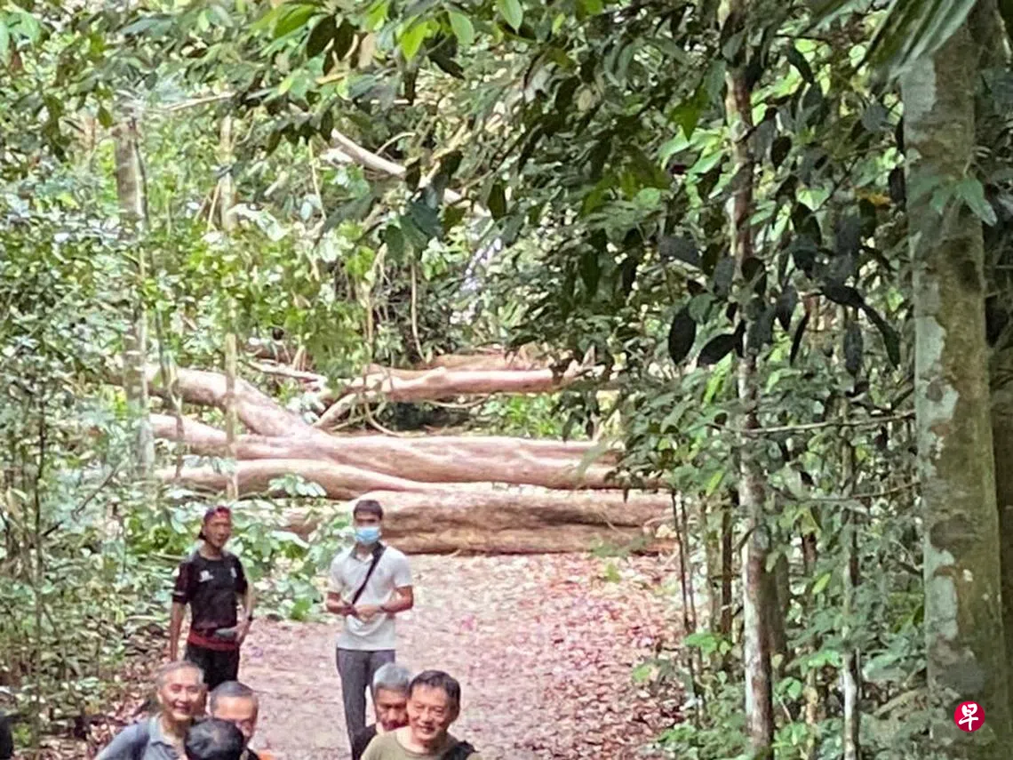 读者江先生(35岁)告诉记者,他今早10时25分左右顺着麦里芝蓄水池公园步道散步,经过靠近汤申路上段的一段小径时,看见前方横着一棵大树,树干的宽度比人还高,完全无法通行。