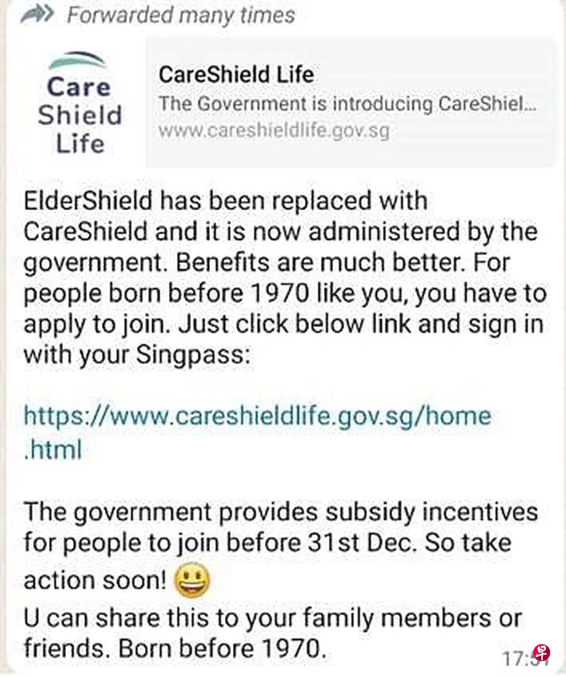 据记者了解,其中一则短信附上链接,邀请1970年之前出生的人输入Singpass加入终身护保,还声称在12月31日之前加入有津贴。实际上,卫生部提供的奖励金(participation incentive)是给1979年及之前出生的人,他们不必强制加入,如果在2023年12月31日之前选择加入,都可以获得这笔奖励金。