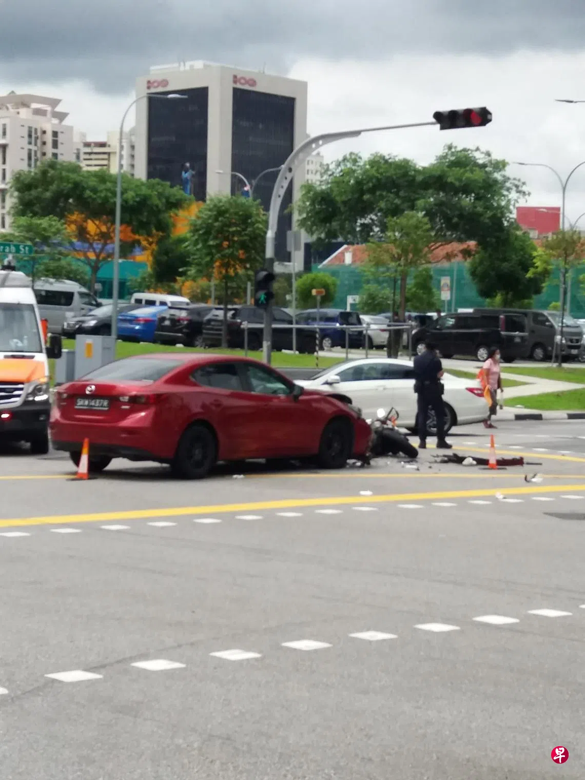 (早报讯)一辆红色汽车与电单车相撞,24岁电单车骑士受伤送院。