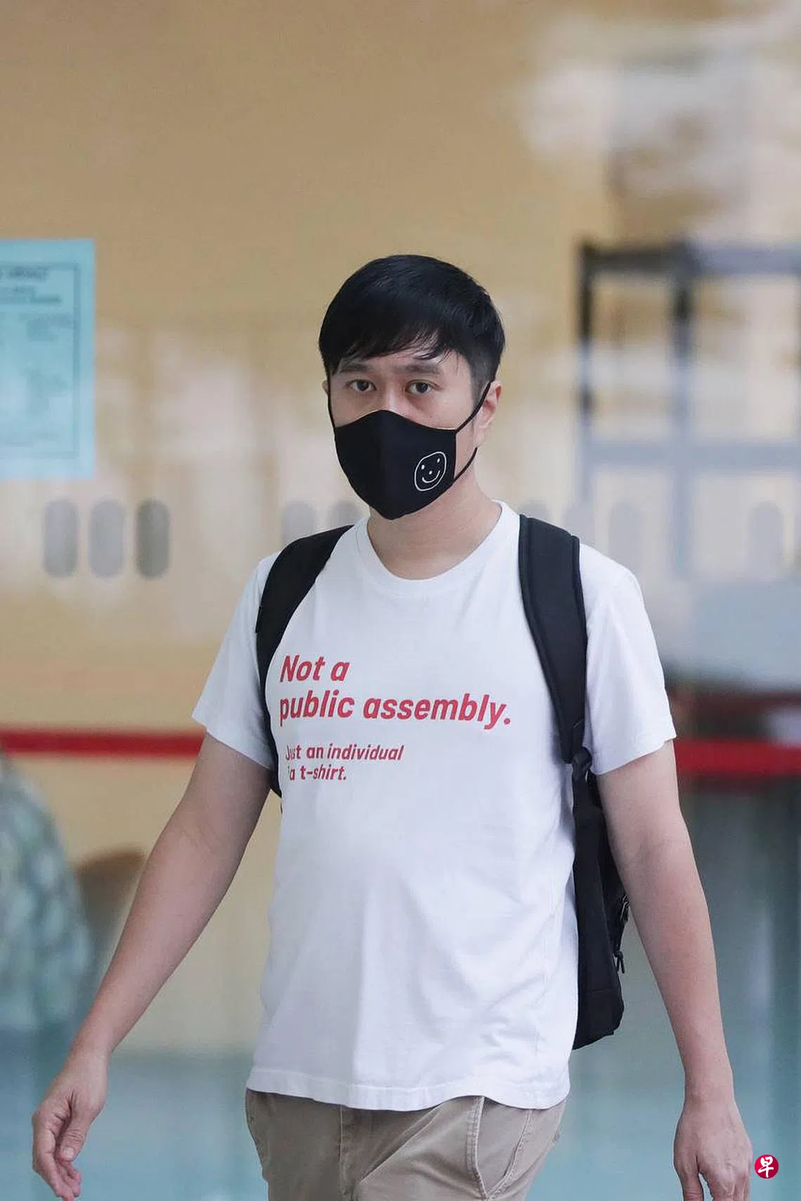 被告今天穿着印有“这不是一个集会”字眼的T恤,在七名友人的陪同下出庭聆讯。