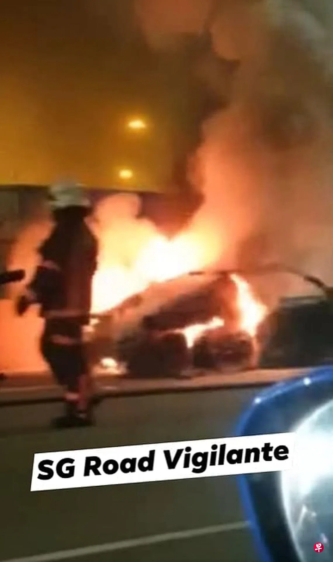 (早报讯)保时捷不知何故在快速公路起火狂烧,民防部队到场灭火。