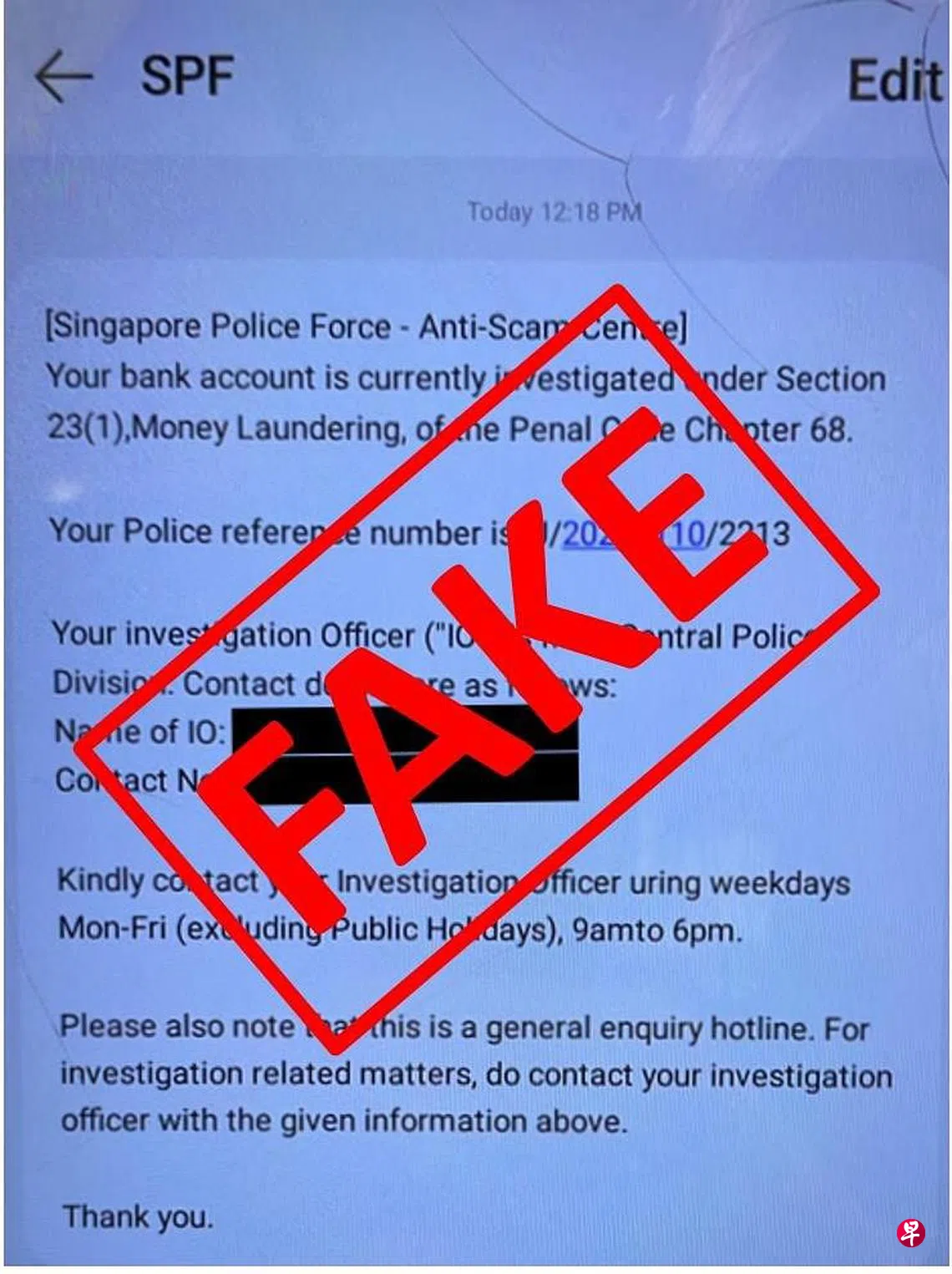 然而,在等待贷款批准之际,他就收到了一则以”SPF”带头的短信,指他涉及洗黑钱活动而被调查,还指示他联络列在短信中的“调查官”。