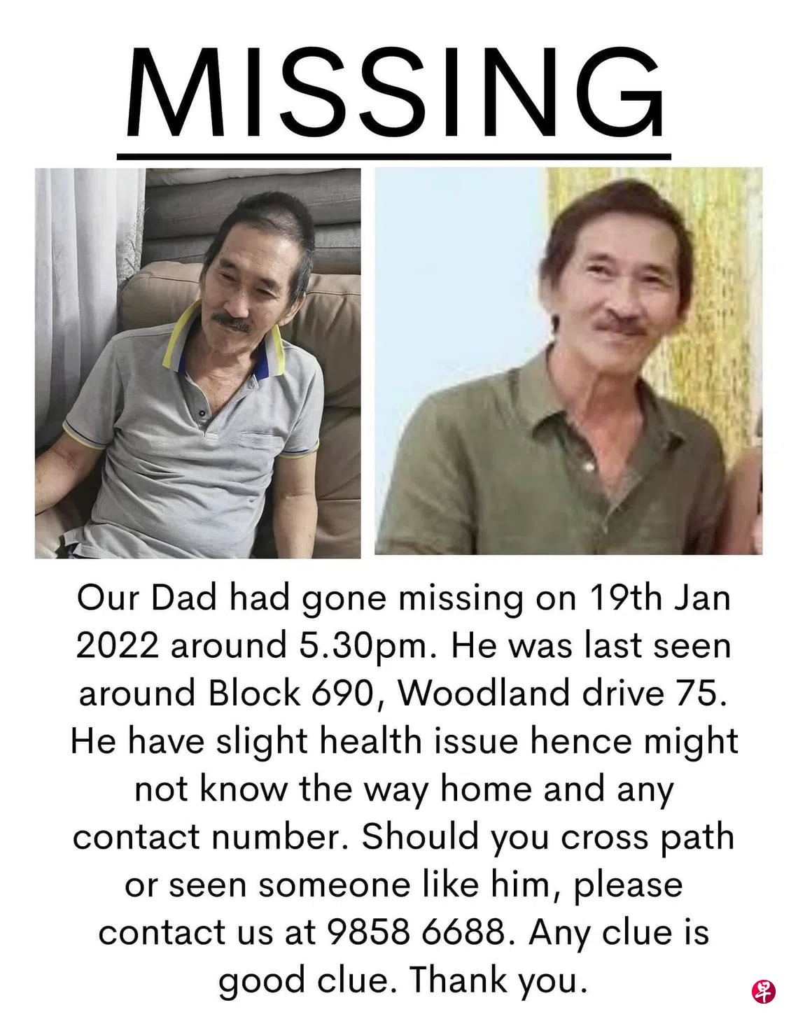 (早报讯)更新:zaobao.sg接获通知,杨才华今天稍早前已被找到了。据杨才华的二女儿透露,父亲免费乘撘一辆德士到宏茂桥后,独自一人走到Northstar@AMK,一名保安人员收留了他,还买晚餐给他吃。