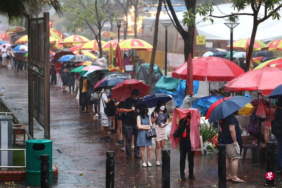 因没带伞而成了落汤鸡的周易琳(44岁,银行经理)说,就算被淋湿也不会离开队伍。“我今天来这里‘借红包’也来还我两年前借的红包,祈求阖家平安喜乐。身上还有借了两年的红包还没还,即使淋雨,还是会坚持排队。”