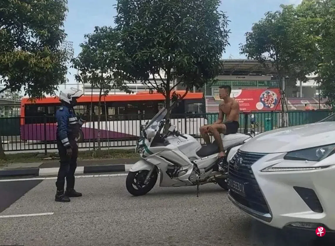 面簿专页“BehChiaLor”昨天上载一张由网民提供的照片,可见事发地点于裕廊西体育场前方的车道,一名男子打赤膊坐在一辆银灰色的电单车上,而电单车则停泊在路中央。