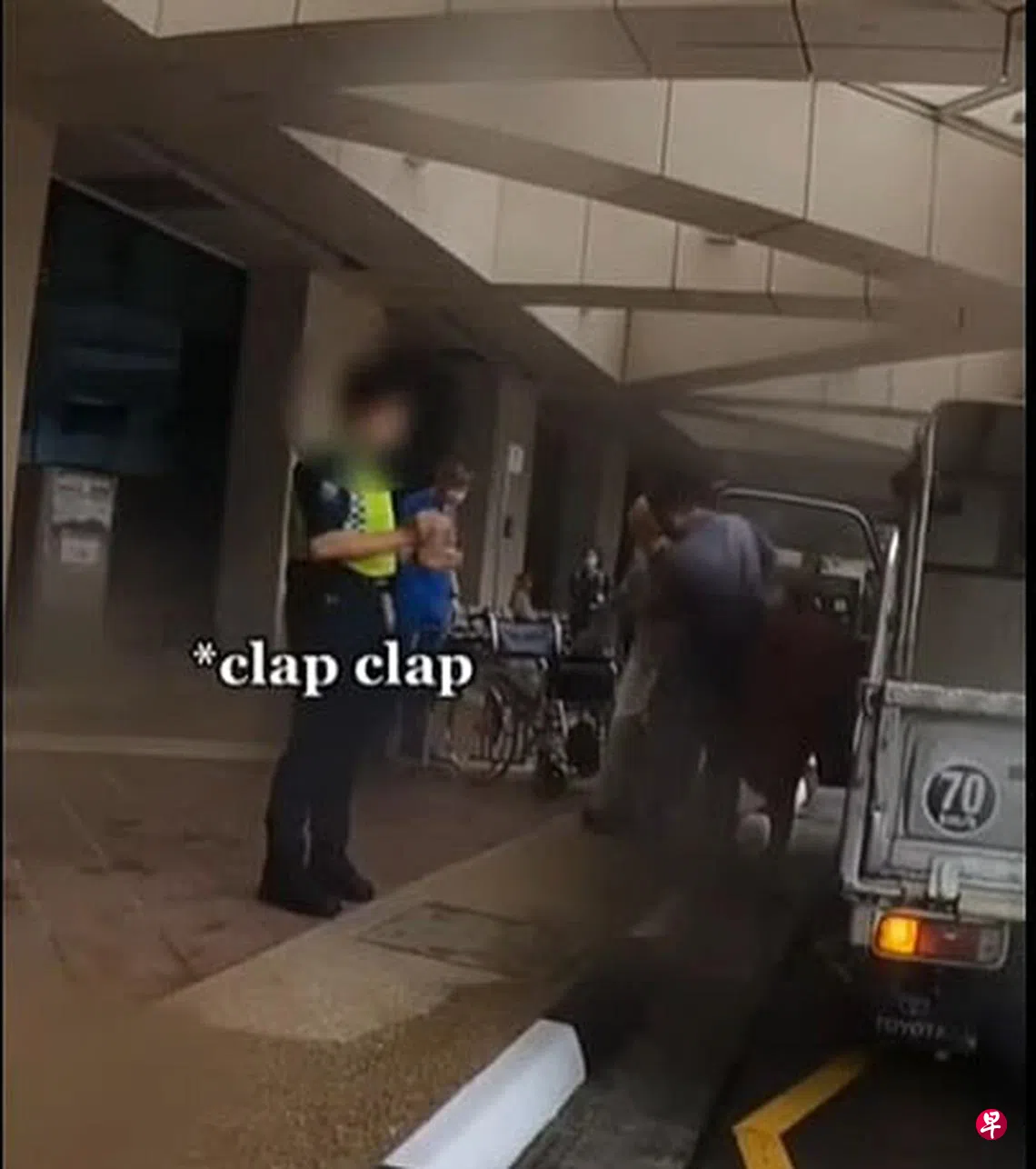 (早报讯)医院保安人员无礼催促一对年迈夫妻赶快下车,期间还不断提高嗓门及拍手,不当行为曝光后立即遭停职。