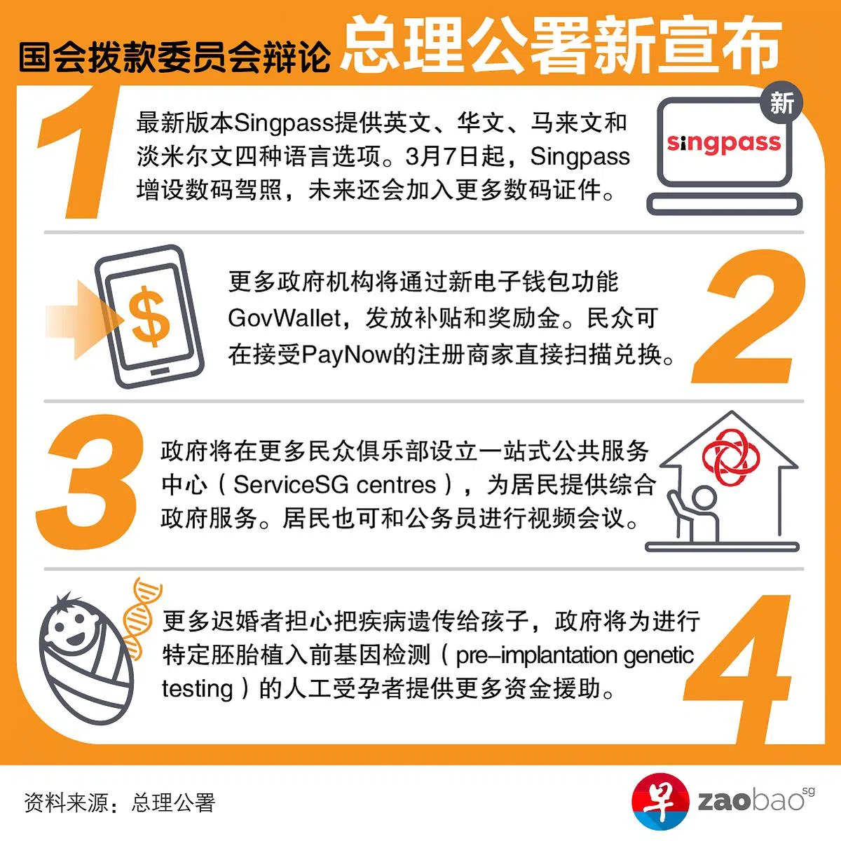 另外,随着迟婚现象愈见普遍,一些夫妻担心会把疾病遗传给孩子,因此政府会为进行特定胚胎植入前基因检测(pre-implantation genetic testing)的人工受孕者提供更多资金援助。当局会在日后公布更多详情。