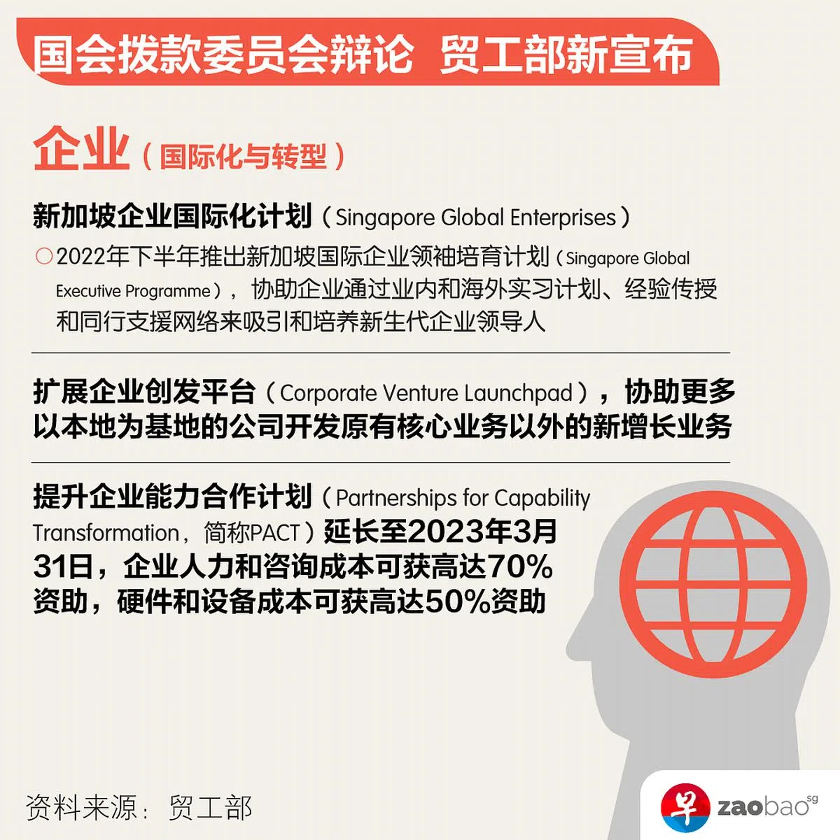 因此政府推出新加坡企业国际化计划(Singapore Global Enterprises,简称SGE),培养新一代的新加坡国际企业。新加坡企业发展局(ESG)和经济发展局(EDB)会为高增长潜力和宏愿的公司提供更多量身定制、以企业为中心的协助。协助的领域包括:培养全球化执行管理人员、创造新的企业起步公司、促进并购、以及改善融资渠道。